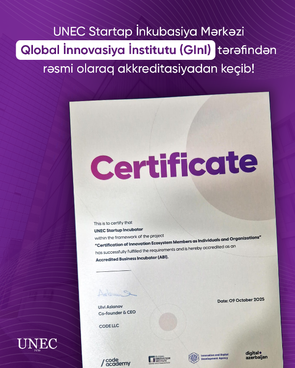 The Startup Incubation Center of the Azerbaijan State University of Economics (UNEC) has officially been accredited by the Global Innovation Institute (GInI) – the world’s leading certification body in the field of innovation.