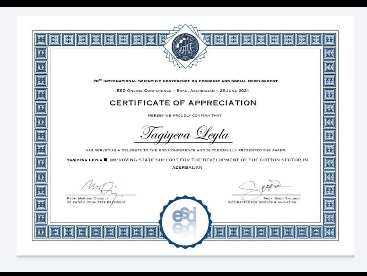 14 may 2025-ci ildə “Sahə iqtisadiyyatı” ixtisası üzrə iqtisadiyyat üzrə fəlsəfə doktoru elmi dərəci almaq üçün dissertasiya müdafiə etmişdir.
